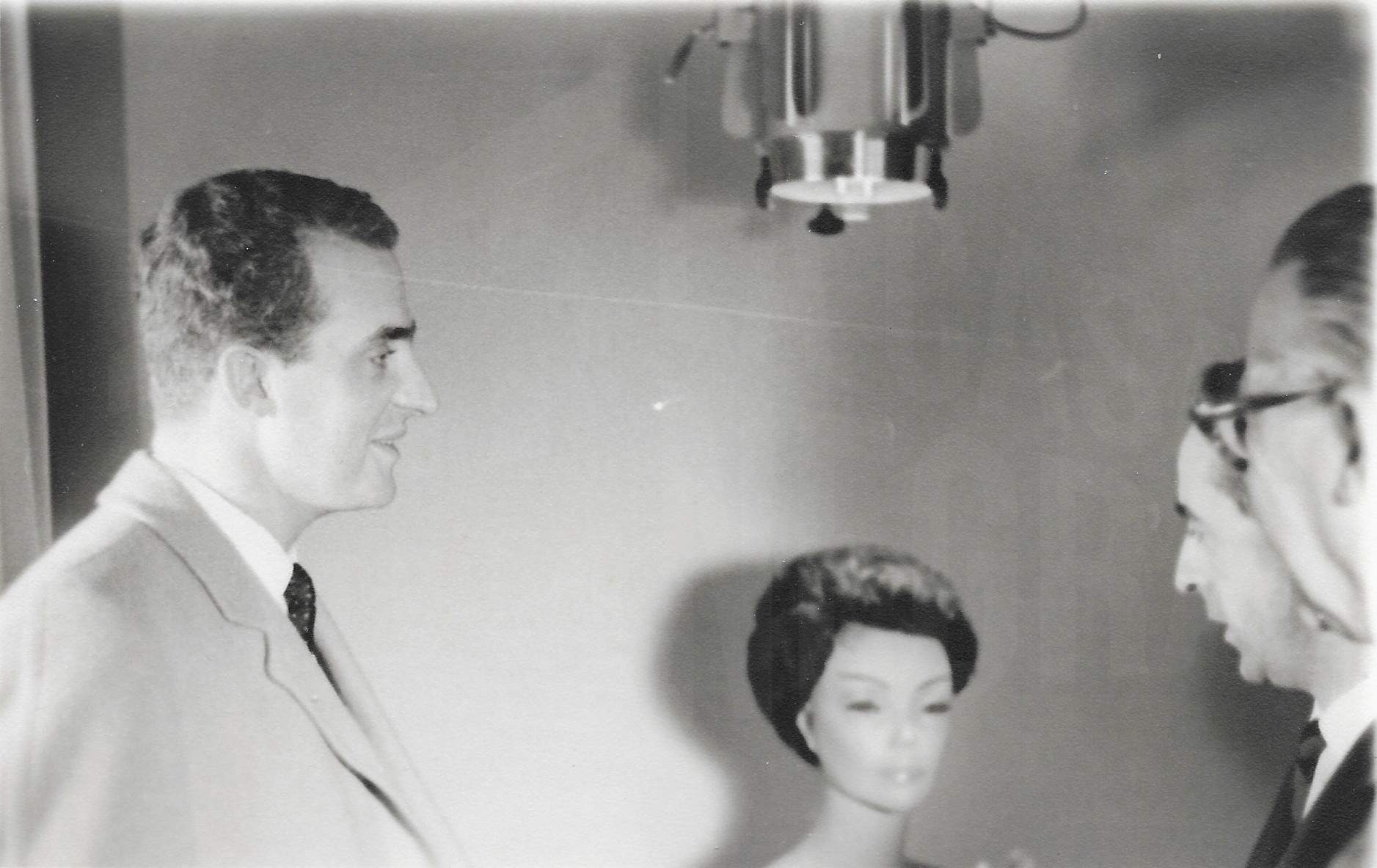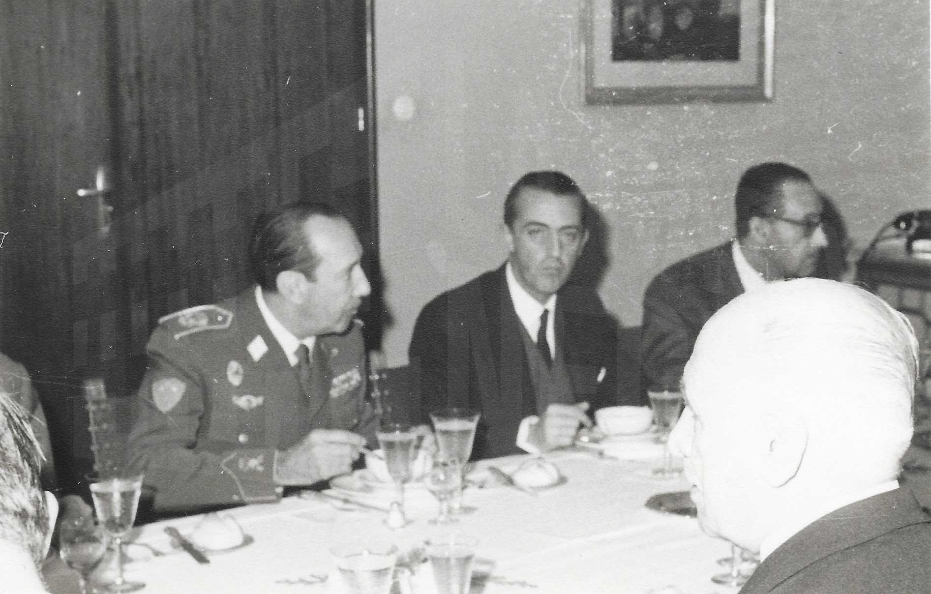 Varias personas durante la comida con motivo de la visita oficial del príncipe Juan Carlos a la fábrica de MAFE (Manufacturas Fotográficas Españolas) en Aranjuez