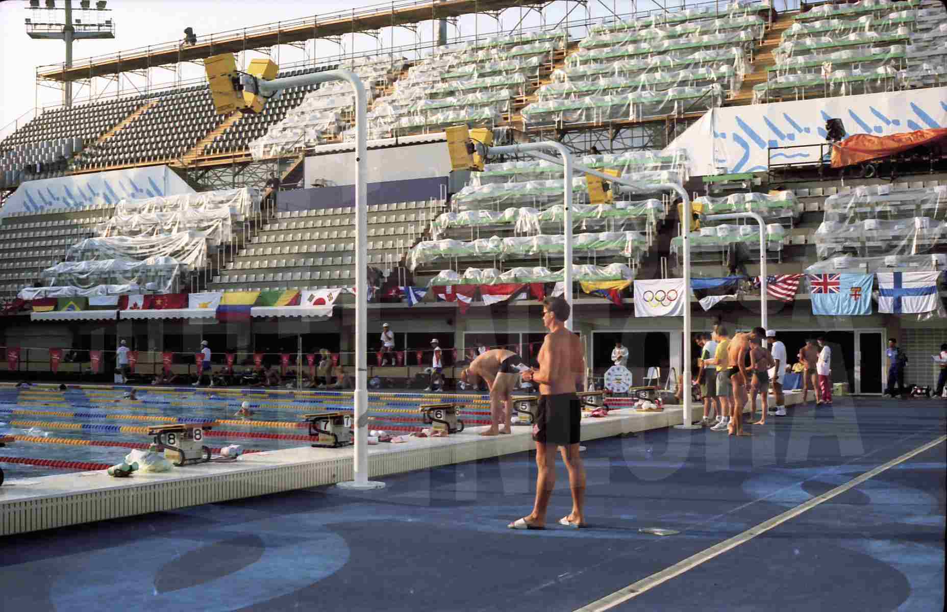 Varios atletas en la piscina antes de una prueba de natación del Pentatlon moderno de los Juegos Olímpicos de 1992