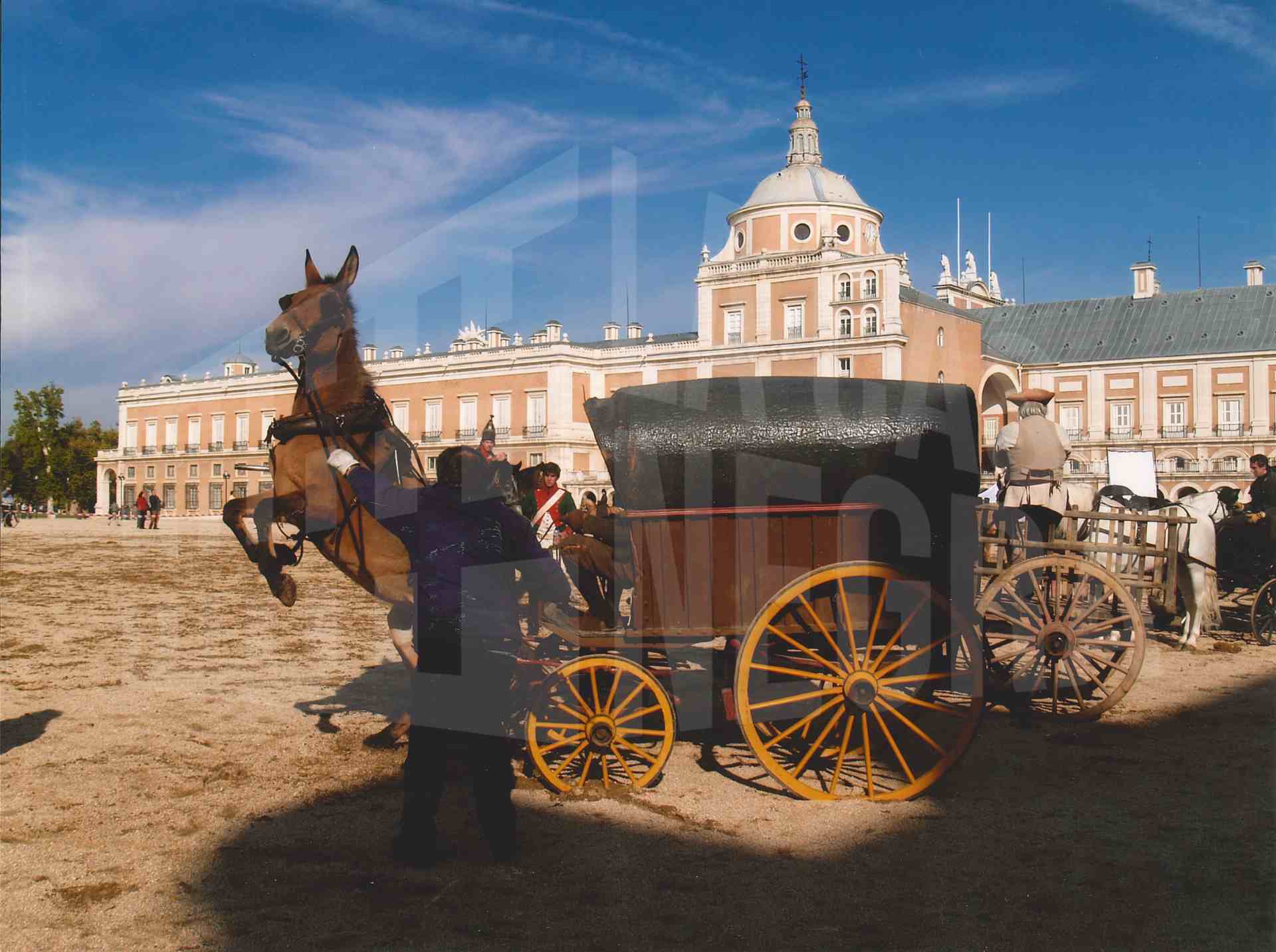 Varios carruajes de caballos durante el rodaje de «Los fantasmas de Goya» en la Plaza de Parejas en Aranjuez