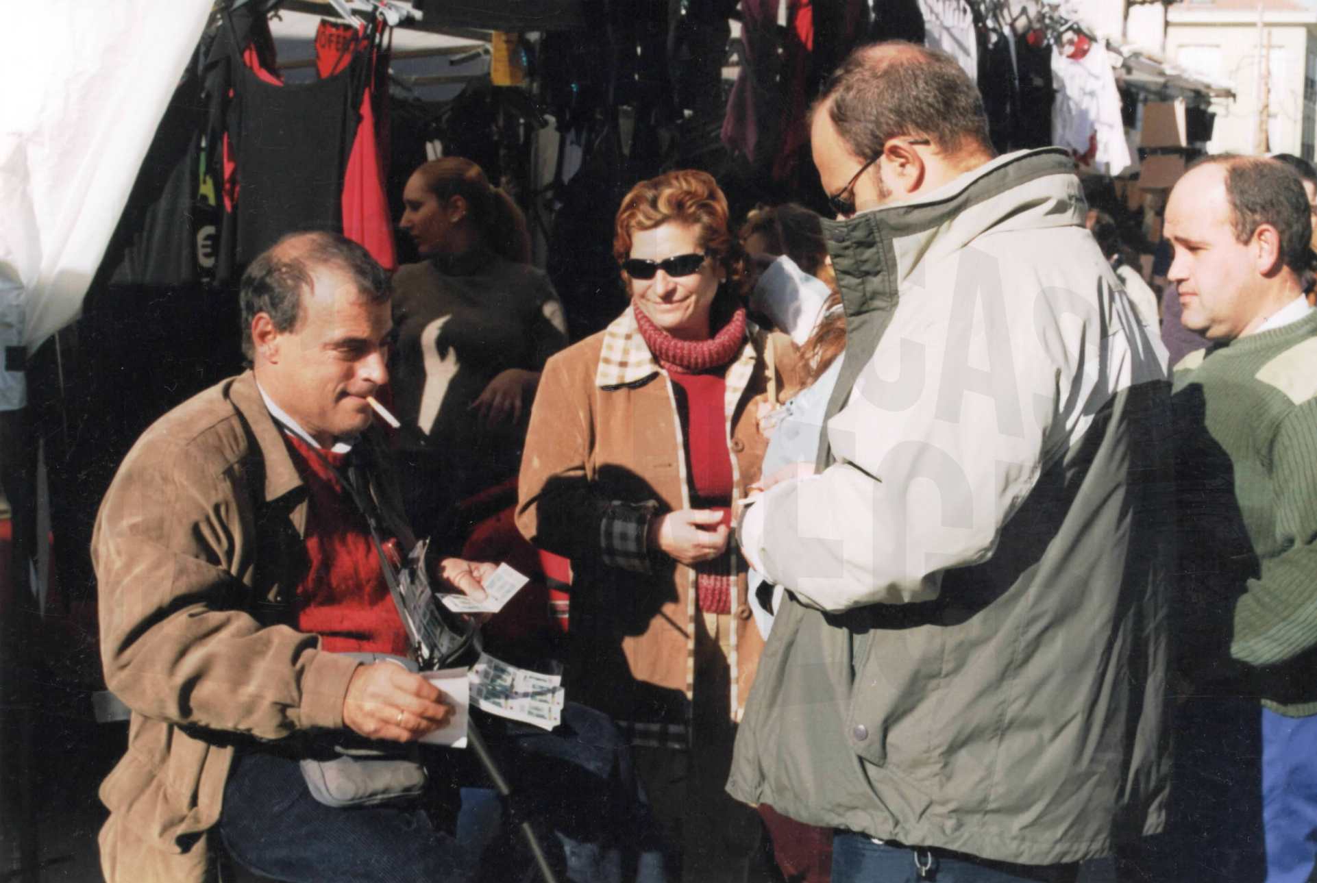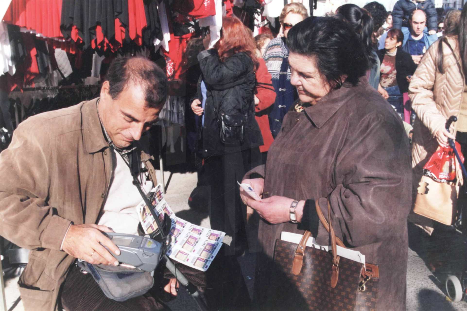 Vendedor de lotería de la ONCE con una clienta en el Rastro de Aranjuez