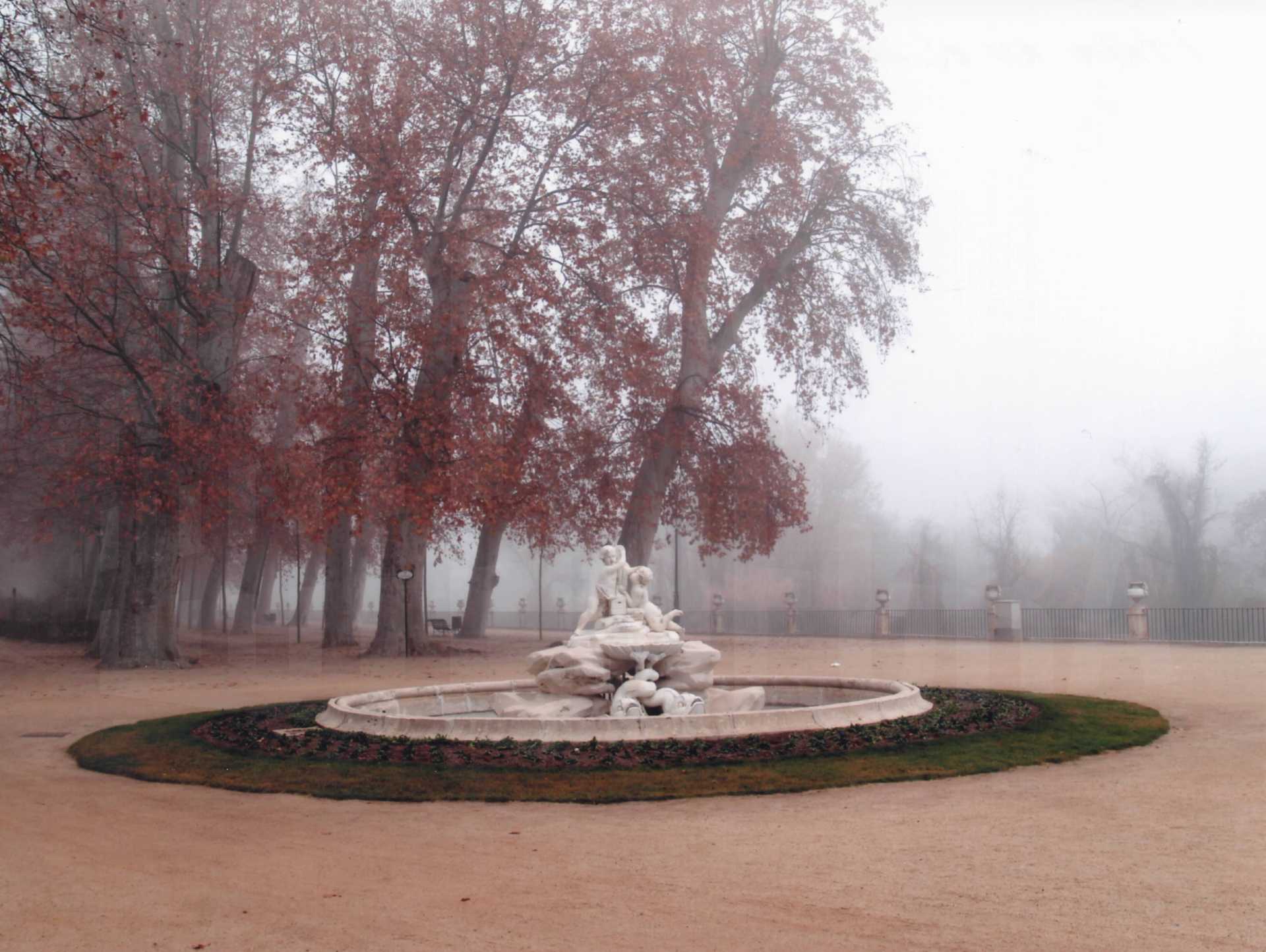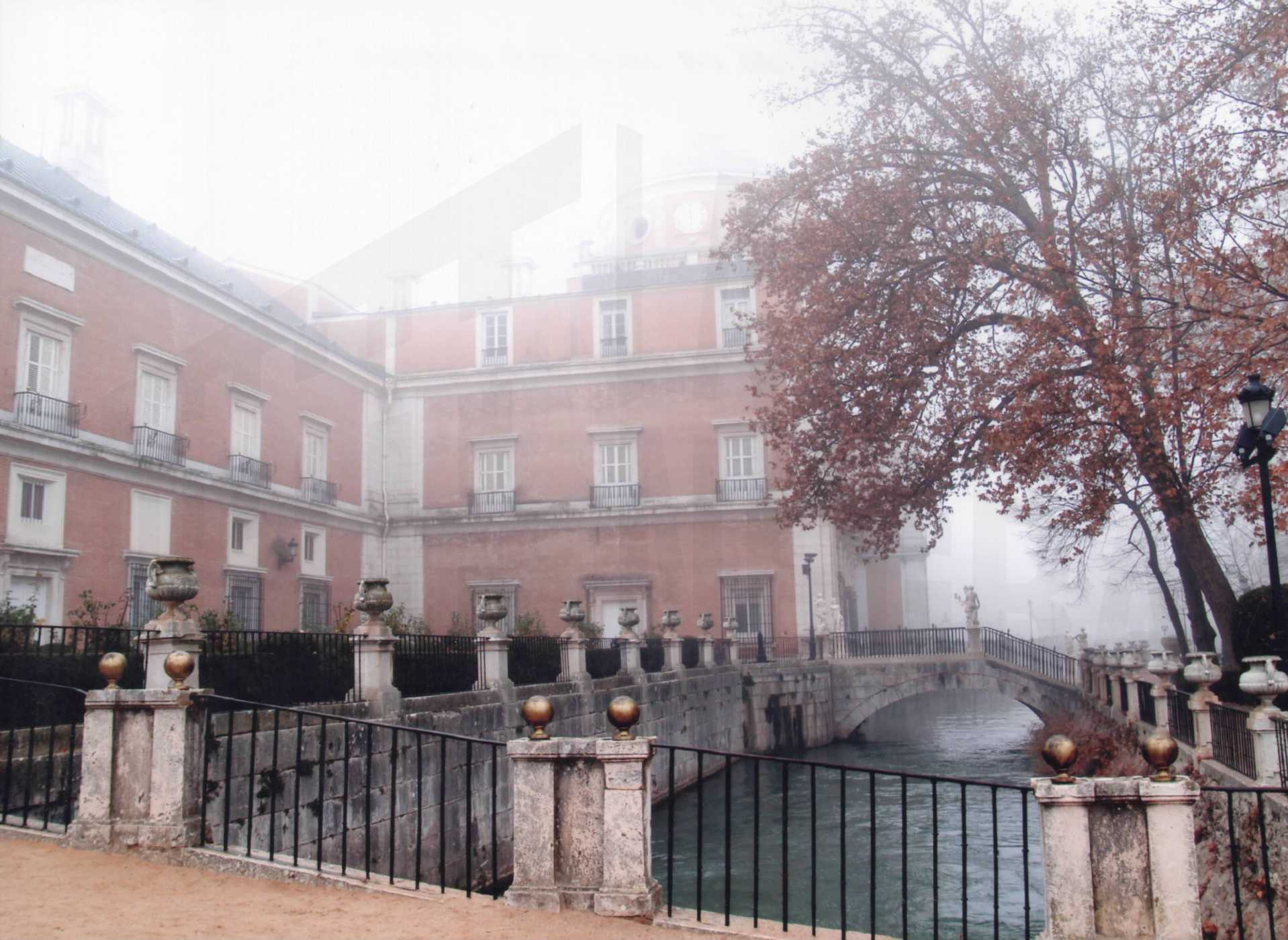 Vista del Palacio Real de Aranjuez y del Puente de la Escalinata en el Jardín de la Isla entre la niebla