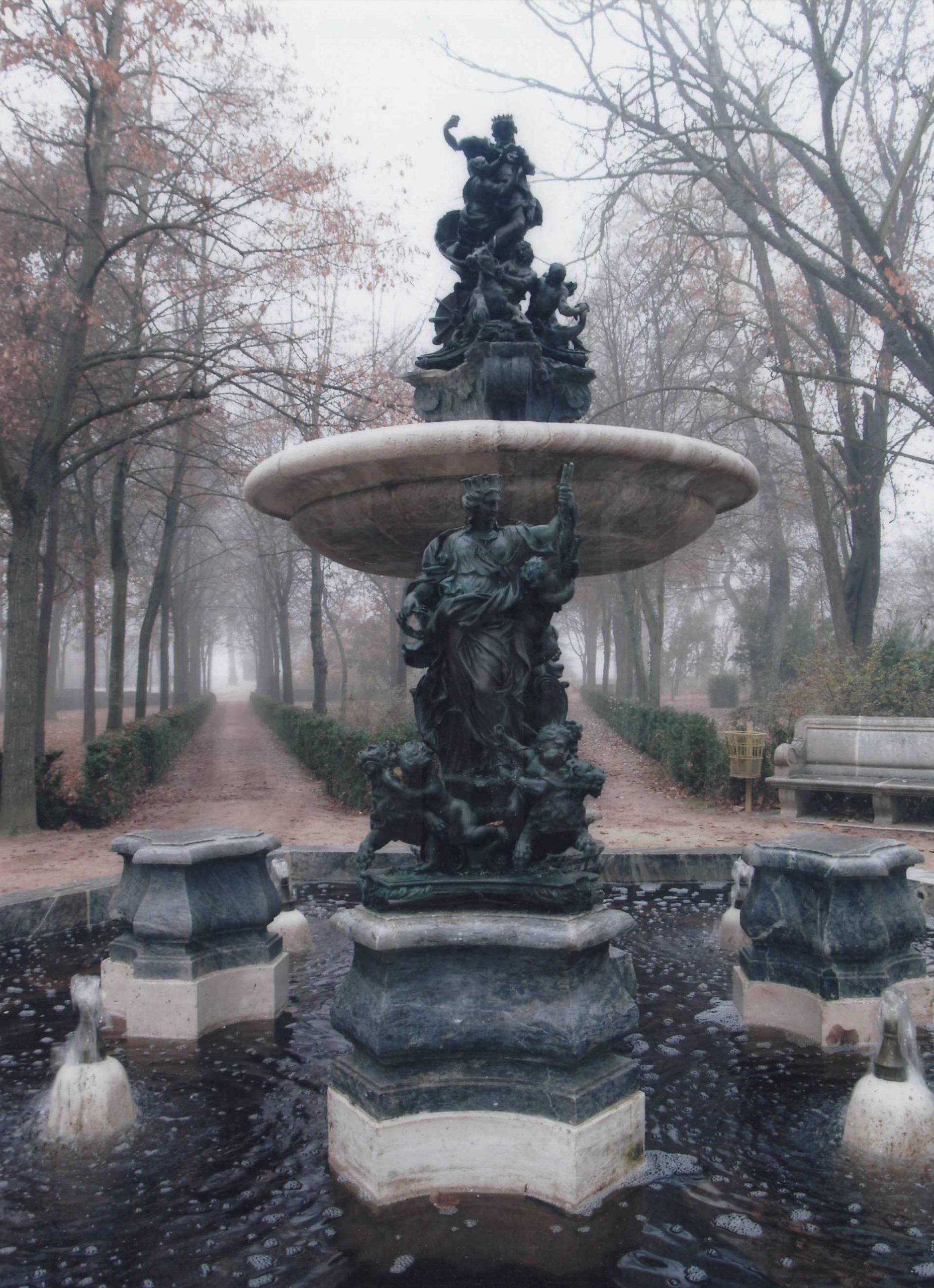 Vista posterior de la Fuente de Venus del Jardín de la Isla de Aranjuez, al fondo la Pajarera
